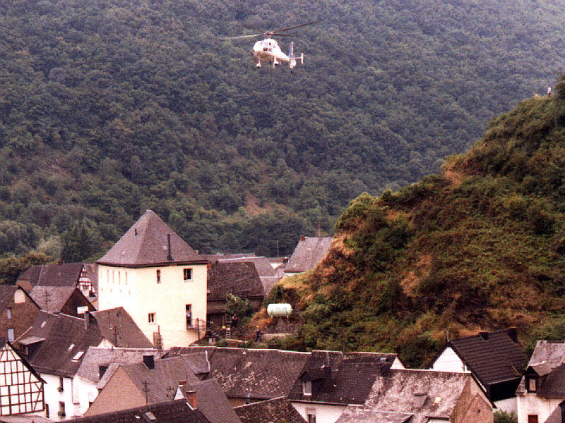 Zur Beheizung eines mittelalterlichen unter Denkmalschutz stehenden Burgturms an der Mosel kam nur ein Aufstellungsstandort in Frage - ein Steilhanggelände hinter dem Burgturm. Selbst ein Schwerstlastkran wäre wegen der engen Zufahrtsstraßen als Transportmittel gescheitert.