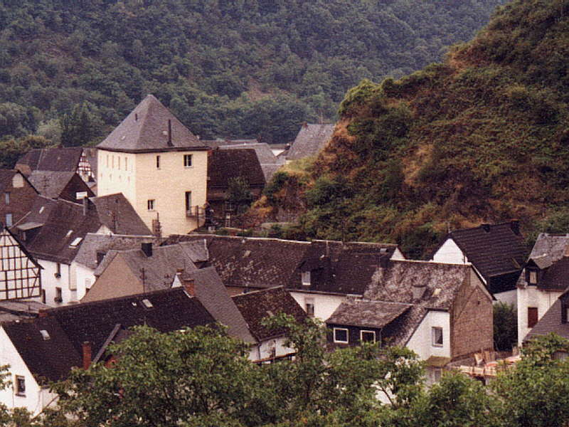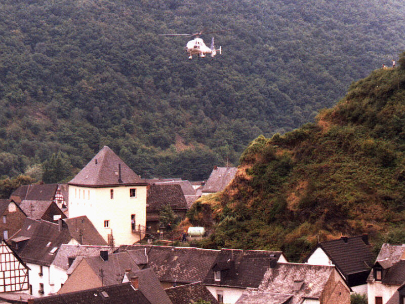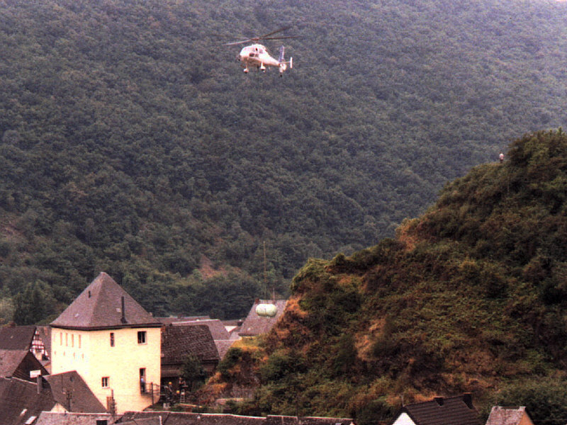 Zur Beheizung eines mittelalterlichen unter Denkmalschutz stehenden Burgturms an der Mosel kam nur ein Aufstellungsstandort in Frage - ein Steilhanggelände hinter dem Burgturm. Selbst ein Schwerstlastkran wäre wegen der engen Zufahrtsstraßen als Transportmittel gescheitert.
