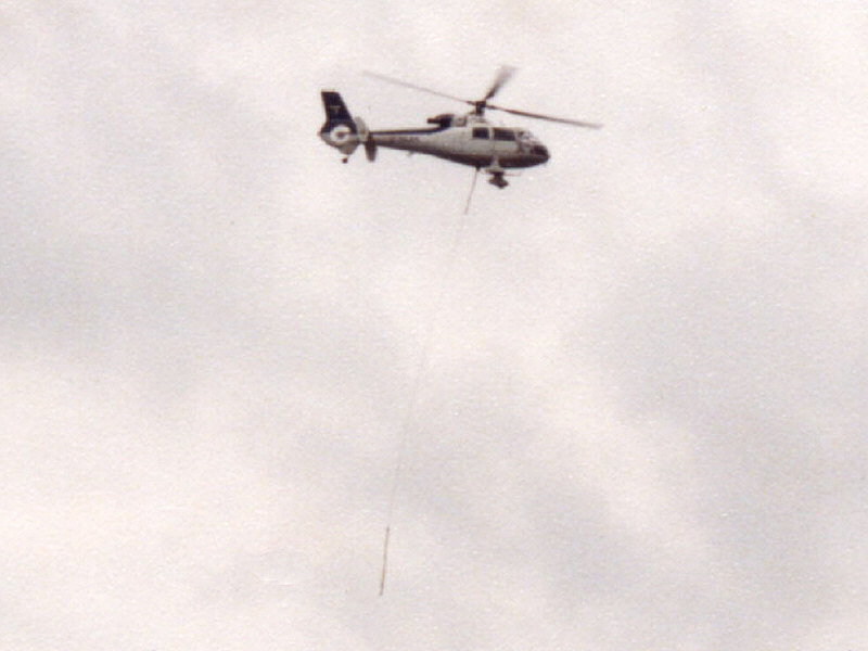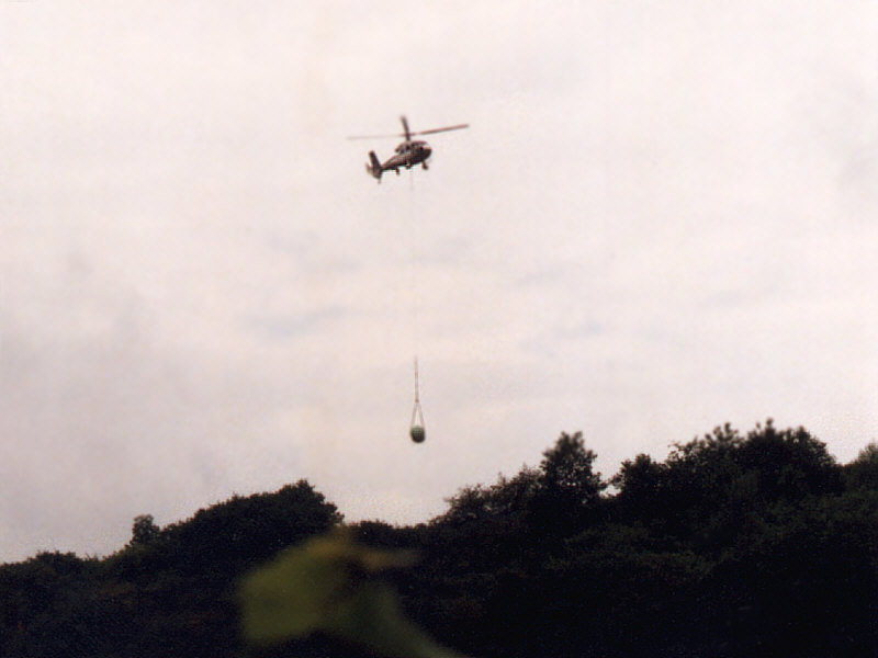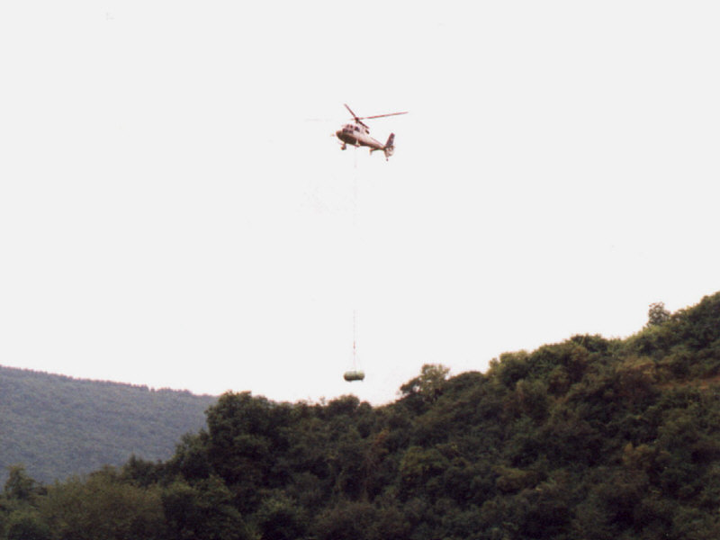 Mittels eines langen Transportseils konnte der Flüssiggasbehälter nicht einfach auf die spezielle im Hang gesicherte Betonplatte abgesetzt werden, sondern wurde den letzten Meter eingeschwungen. Der Pilot musste dafür mit professioneller Erfahrung in 20 Meter Höhe das Seil vom Hubschrauber ausklinken.